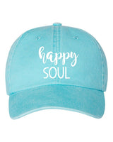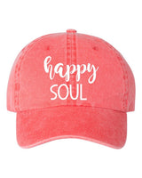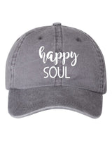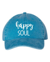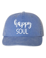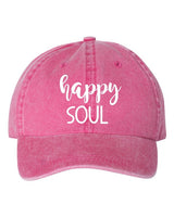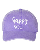 The 'Happy Soul' Embroidered Washed Pigment Dyed Cotton Twill Cap Is Adorably Chic and Sweet and Can Be All In One Professionally Embroidered with Industrial machine. 100% cotton Self-fabric strap w/brass buckle & sewn grommet