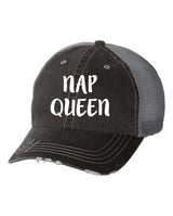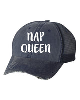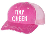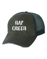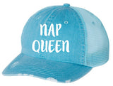 'Nap Queen' Sends a Fun Message All Season Long, Embroidered on Our Most Popular Trucker Hat with Velcro Closing - Perfect Fit! Everyone Loves It Professionally Embroidered with Industrial machine on our Distressed Trucker Hat. 80% cotton/20% polyester, Herringbone fabric 100% polyester mesh back Unstructured, six-panel, low-profile Pre-curved fray visor with contrasting undervisor Velcro closure