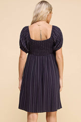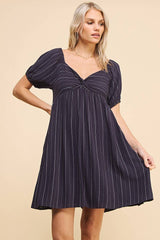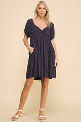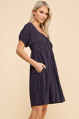 Our Navy Taylee Twist Front Stripe Dress Linen Babydoll Dress is Adorably Stylish, Lightly Lines and Beautiful with Pockets. You'll Love its Mid-length Style