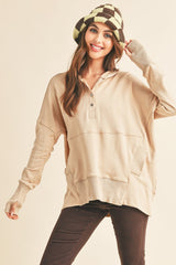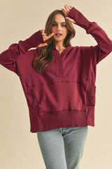 Embrace ultimate comfort with our oversized Vivi hoodie pullover, perfect for post-workout or leisure time. It boasts a button-up neckline and boldly ribbed piecing, adding a touch of style. The front pouch pocket and thumbholes at cuffs enhance functionality, while the dropped dolman sleeves ensure a relaxed fit. Stay cozy and fashionable in this go-to sweatshirt for any occasion.