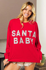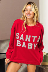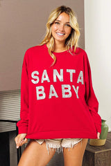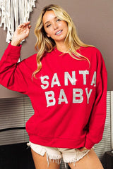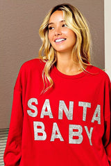 Embrace the holiday spirit with this festive "Santa Baby" lettering Christmas sweatshirt. Perfect for adding a touch of Christmas cheer to your winter wardrobe. The stylish design and cozy fabric make it a must-have for the holiday season. Spread joy and laughter wherever you go in this fun and playful sweatshirt. Makes a great gift for friends and family who love the Christmas season.